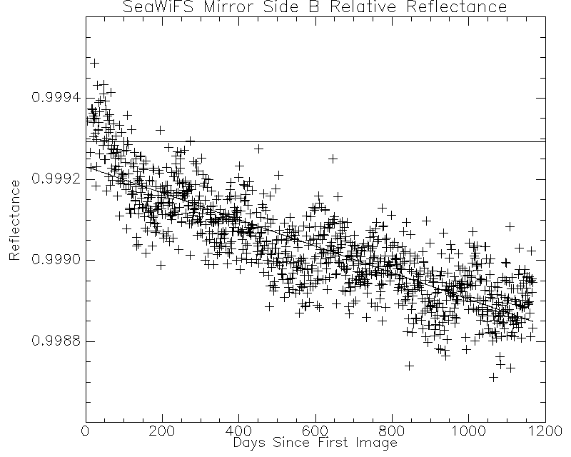 The second update to the calibration table is the incorporation of a set of revised half-angle mirror side reflectances. During ocean observations, adjacent LAC or HRPT scan lines are observed by different sides of the half-angle mirror. The level-1b algorithm corrects for the difference in the relative reflectance of the two mirror sides.Figure 2 and Figure 3 show the relative reflectances of the two mirror sides, as measured on orbit. The sloping lines are linear fits to the measured reflectances, while the horizontal lines show the prelaunch values of the reflectances that the level-1b algorithm has been using prior to this update. The differences between the measured reflectances and the prelaunch values now occasionally give rise to one-count differences between adjacent scan lines in the ocean data. To correct these differences without changing the level-1b algorithm, the CVT has determined the value of the mirror side reflectances from the linear fits for the starting times of each of the time correction segments in the calibration table. The mirror side reflectances contained in the calibration table are updated with the appropriate values at the start of each time segment. This provides a series of step-function adjustments to the mirror side reflectances that will keep the differences in the adjacent scan lines to less than one count. During the next reprocessing, the level-1b algorithm will be modified to apply mirror side reflectances that vary smoothly with time.