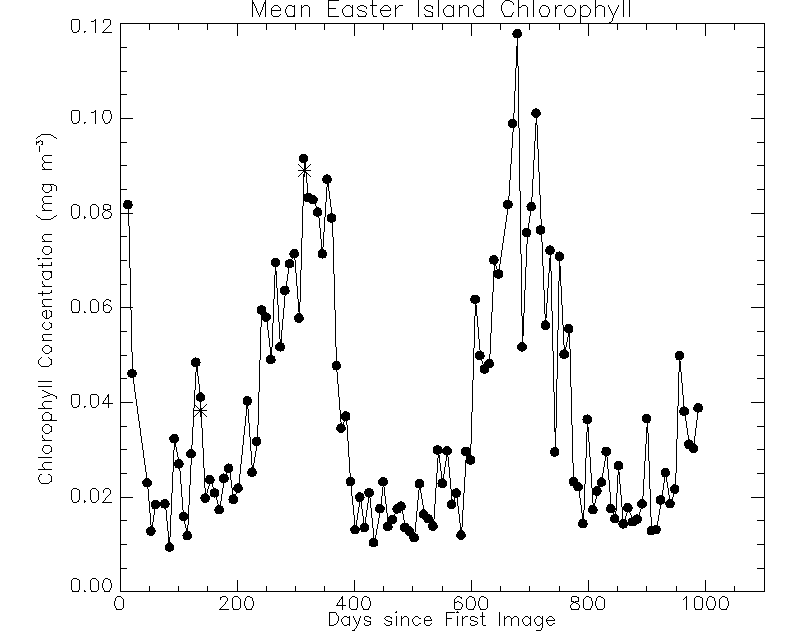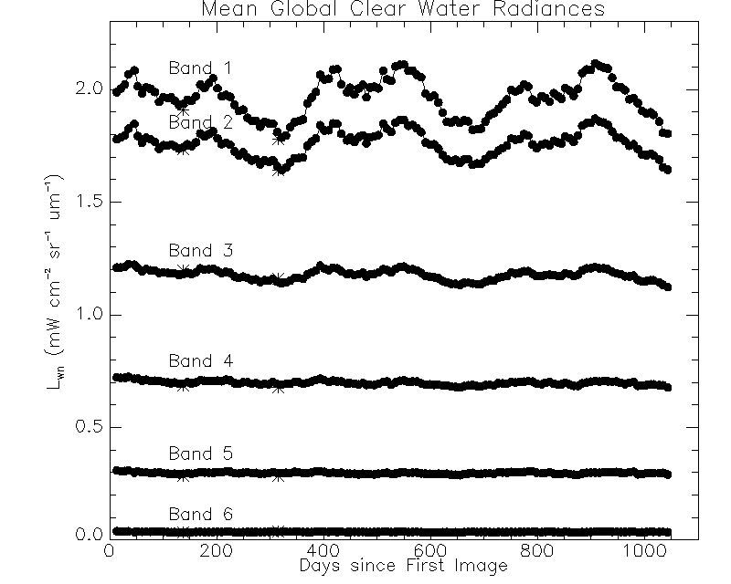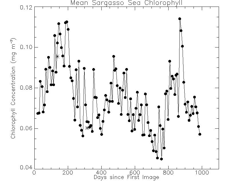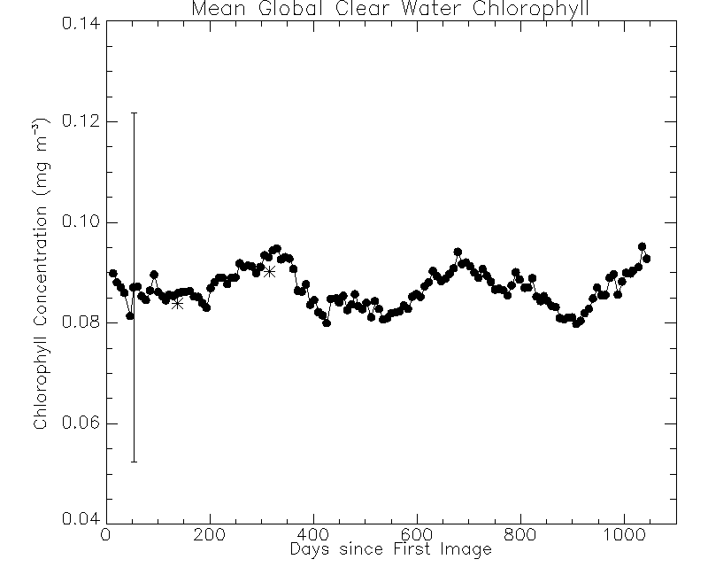 The update to the vicarious gains incorporates an improved implementation of the out-of-band correction to the SeaWiFS data during the vicarious calibration. The modified out-of-band correction resulted in small adjustments to the vicarious gains. The effect of these gain changes on the retrieved normalized water-leaving radiances and chlorophyll concentrations are shown in Figures 4-7. Figure 4 shows the time series of global mean clear-water radiances computed from the operational 8-day timebin files over the course of the mission, with the values from two 8-day timebins computed with the adjusted gains represented by asterisks. Clear-water radiances are radiances computed for waters with a minimum depth of 1 km and a maximum chlorophyll concentration of 0.15 mg/m^3. The corresponding chlorophyll time series is shown in Figure 5, along with a typical error bar on the chlorophyll concentration. The changes in the radiances and in the chlorophyll concentrations due to the adjusted gains are well within the errors of the mean values and within the timebin-to-timebin variations.Figure 6 and Figure7 show how the adjusted gains affect the chlorophyll concentrations on a regional basis, with Figure 6 showing data for the Sargasso Sea and Figure 7 showing data in the vicinity of Easter Island. Again, the changes in the chlorophyll concentrations are small. During the next reprocessing, the improved out-of-band correction will be applied to the entire mission data set.
