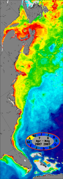 The MODIS instrument on NASA's Aqua satellite has been measuring ocean color since mid-2002. Roll your pointer over the above image of the east coast of North America to view an animation of 10 years (2003 - 2012) of MODIS-derived oceanic chlorophyll concentrations in the region.