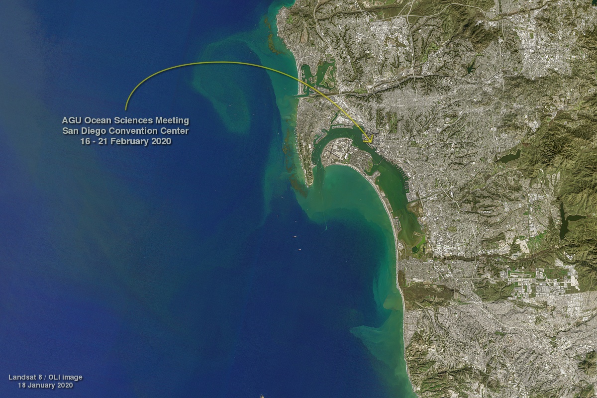 What better place for an Ocean Sciences Meeting than by the shore of Earth's largest ocean. This meeting will take place in San Diego in mid February 2020 which can be seen above in a Landsat 8 image collected on January 18, 2020. Click on it to get a much larger (73 megabyte) version. |